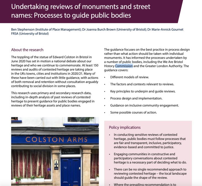 This guidance focuses on the best practice in process design rather than what action should be taken with individual monuments. It has informed the processes undertaken by a number of public bodies, including the We Are Bristol History Commission and the Greater London Authority.