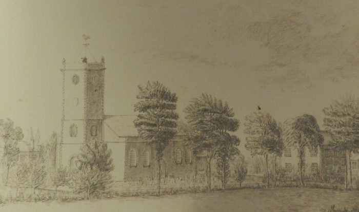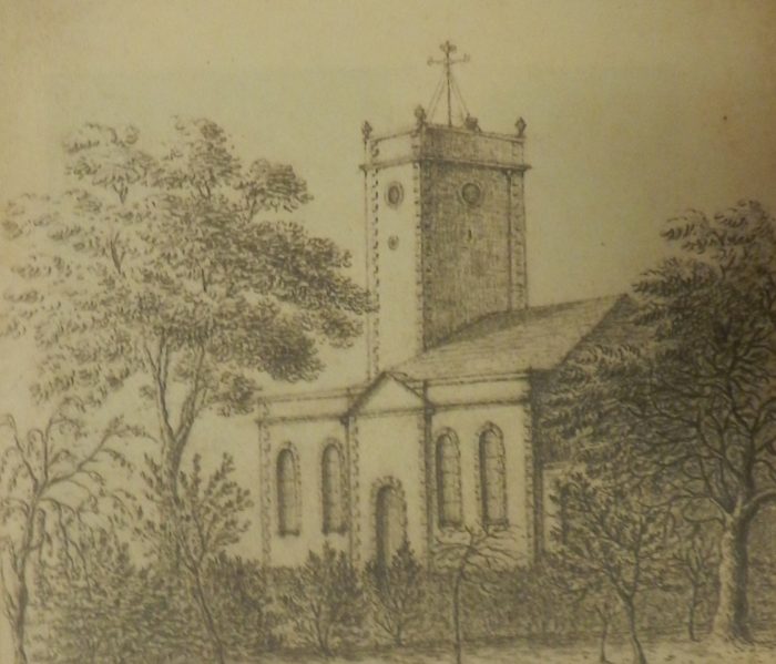 After Rev John Emra died in 1842 a new vicar took over, he deemed the church "not very ecclesiastical," so it was rebuilt 1846. Here is an image of that second church, the first illustration of it that we have seen.