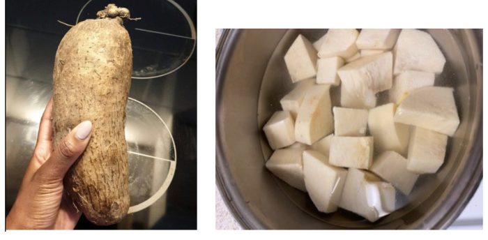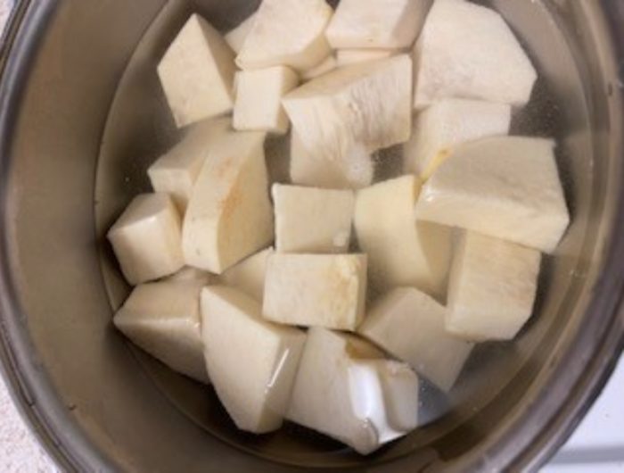 Put the cut pieces of yam in the pot, add some water, salt and boil.