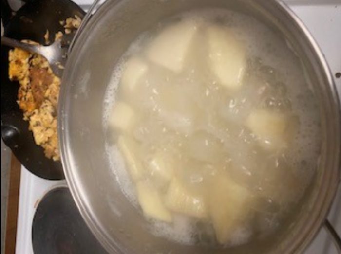 Drain the water from the cooked yam. Put the yams on a plate and add your cooked eggs.